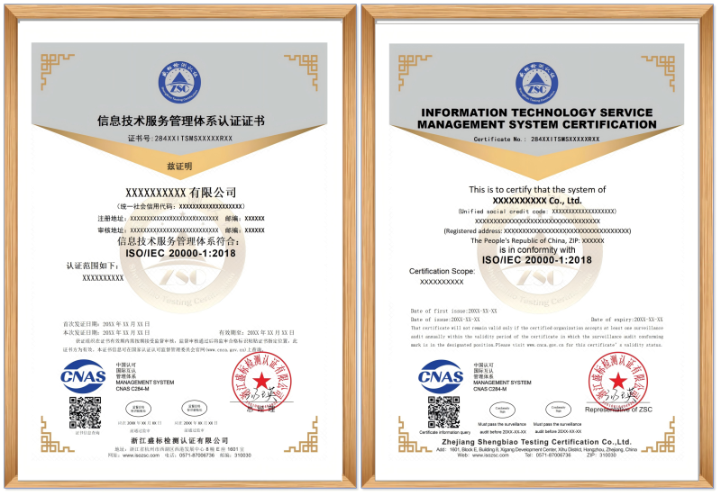信息技術(shù)服務(wù)管理體系(ITSMS)認證證書(shū)樣本: