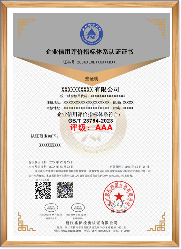 企業(yè)信用評價(jià)指標選取主要從企業(yè)守信意愿(價(jià)值觀(guān))、守信能力(競爭力)和守信表現(社會(huì )責任)三個(gè)維度展開(kāi),在傳統信用評價(jià)基礎上,考慮了企業(yè)在社會(huì )信用方面的指標評價(jià),對于推動(dòng)企業(yè)質(zhì)量信用評價(jià)工作、提高企業(yè)產(chǎn)品質(zhì)量和競爭力具有重要意義,浙江盛標檢測認證公司以科學(xué)性、合理性、適用性的原則根據標準和相關(guān)法律條文進(jìn)行審查評價(jià)、監督和認證。