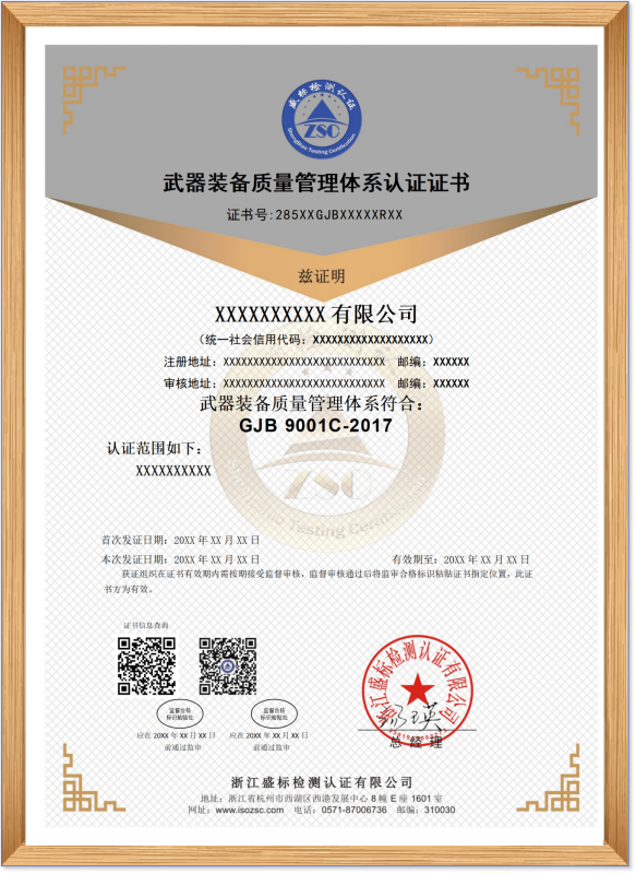 GJB 9001C-2017 武器裝備質(zhì)量管理體系認證證書(shū)樣本:
