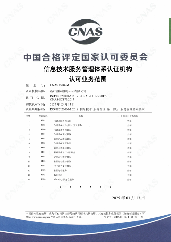CNAS管理體系認證機構認可證書(shū) - 信息技術(shù)服務(wù)管理體系  中文版本 :