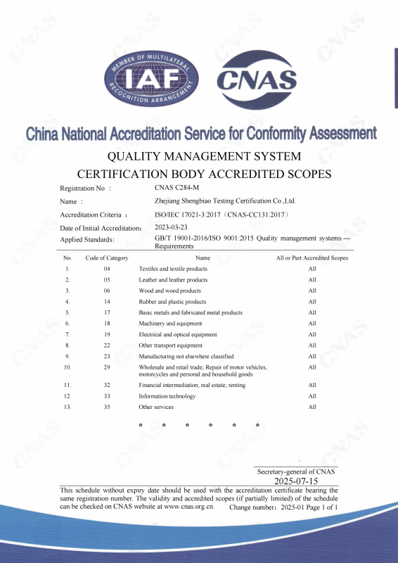 近日,經(jīng)中國合格評定國家認可委員會(huì )(CNAS)嚴格評審,浙江盛標檢測認證有限公司的認證服務(wù)范圍再獲突破,新增23個(gè)認可大類(lèi)!這標志著(zhù)公司在質(zhì)量管理體系(QMS)、環(huán)境管理體系(EMS)、職業(yè)健康安全管理體系(OHSMS)等領(lǐng)域的認證能力進(jìn)一步提升,能夠為更多行業(yè)客戶(hù)提供更專(zhuān)業(yè)、更權威的認證服務(wù)。